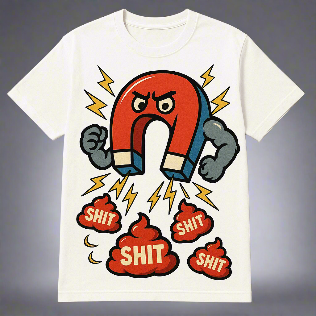 Unleash the chaos. This bold and cheeky tee features an angry magnet attracting a storm of trouble. A comic-style design that’s loud, unapologetic, and totally addictive. For those who attract it all — wear it with pride